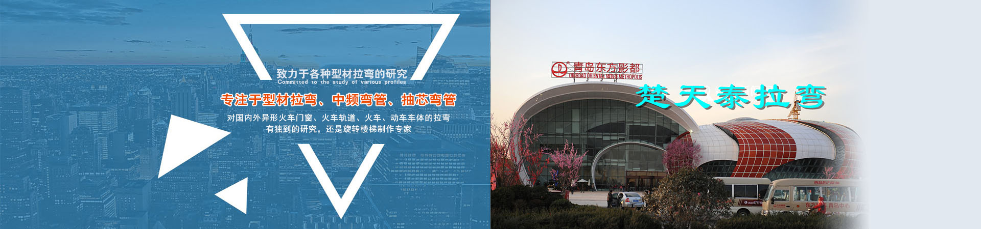 青岛楚天泰弯管加工厂是专业从事型材拉弯、中频弯管、抽芯弯管等拉弯工艺,是拉弯设备设计、制造、销售的专业化新型企业。同时,也是旋转门内外大圈拉弯加工的重要基地,特别是对国内外异形火车门窗、火车轨道、火车、动车车体的拉弯有独到的研究,还是旋转楼梯制作专家。目前公司在青岛、胶州、城阳直接投资设厂。本公司自成立以来,一直致力于各种型材拉弯的研究,已经拥有一大批经验丰富的拉弯工程师,技术过硬的技术员。是山东半岛规模大、设备齐全、实力雄厚的拉弯工厂。现拥有630KW、200KW中频热弯机,能热弯Φ1000mm以下的大圆管,拥有800T、400T大型遥控顶弯机4台,不同吨位的拉弯机9台,13台机器可同时加工生产。量大时,在全国范围内可流动作业。能够冷弯Φ600的大圆管、630×300的工字钢、H型钢、C型钢、W型钢、无缝管、方管、U型槽、槽钢、角钢、扁铁、铝型材(旋转门料、各种系列断桥隔热料、非断热料、推拉窗、无框窗、幕墙...